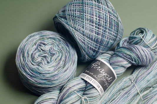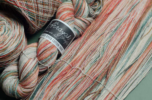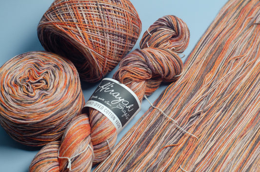 Light worsted weight/ 8ply hand-dyed cotton yarn.