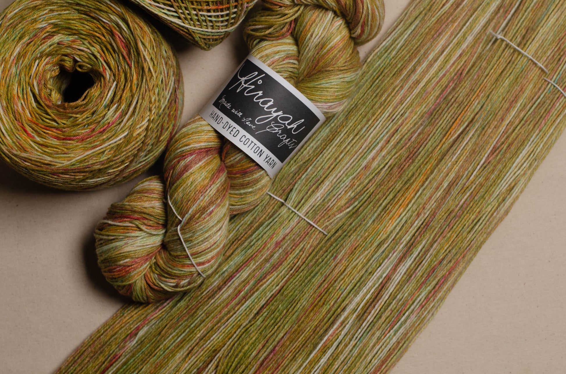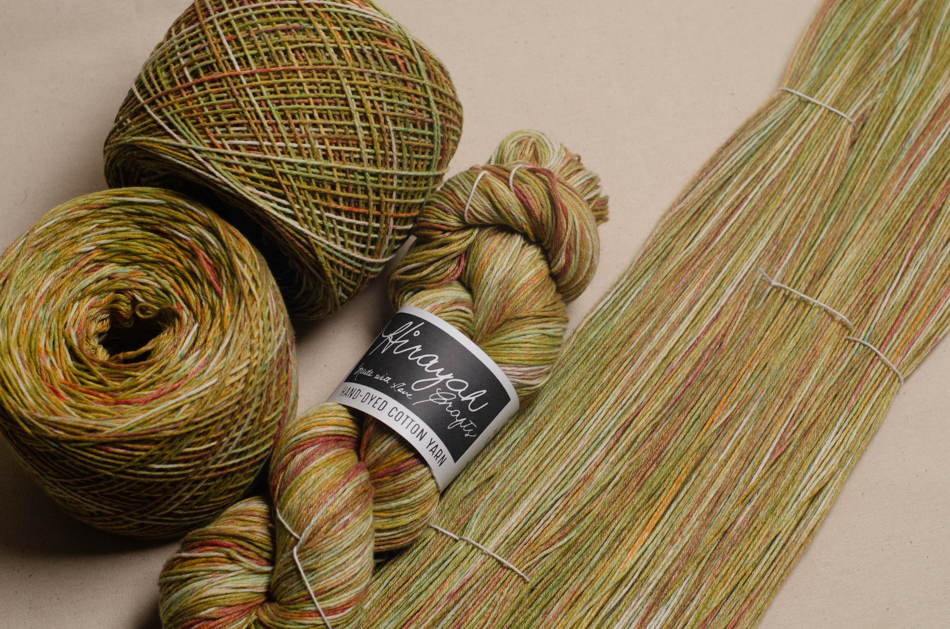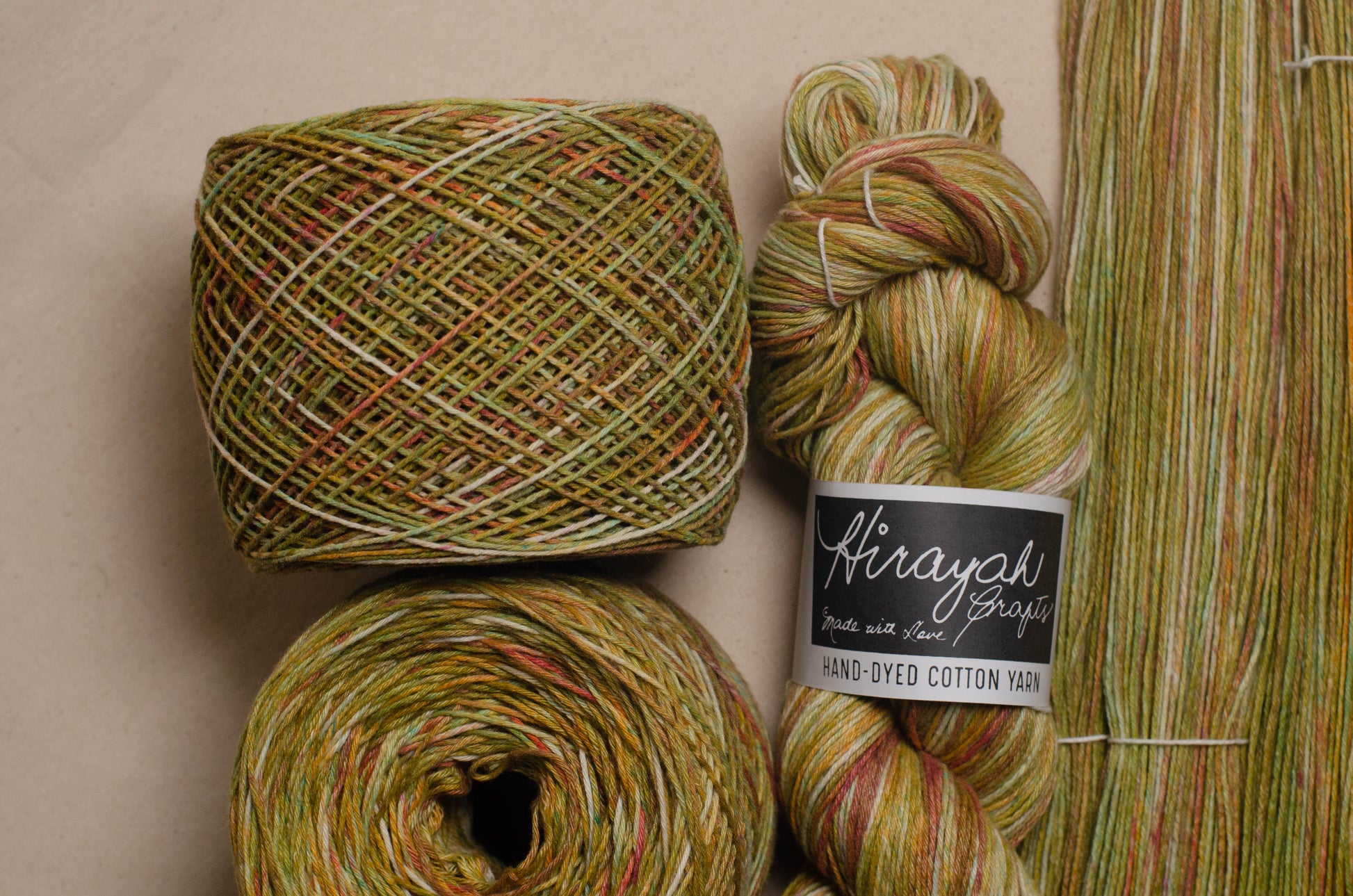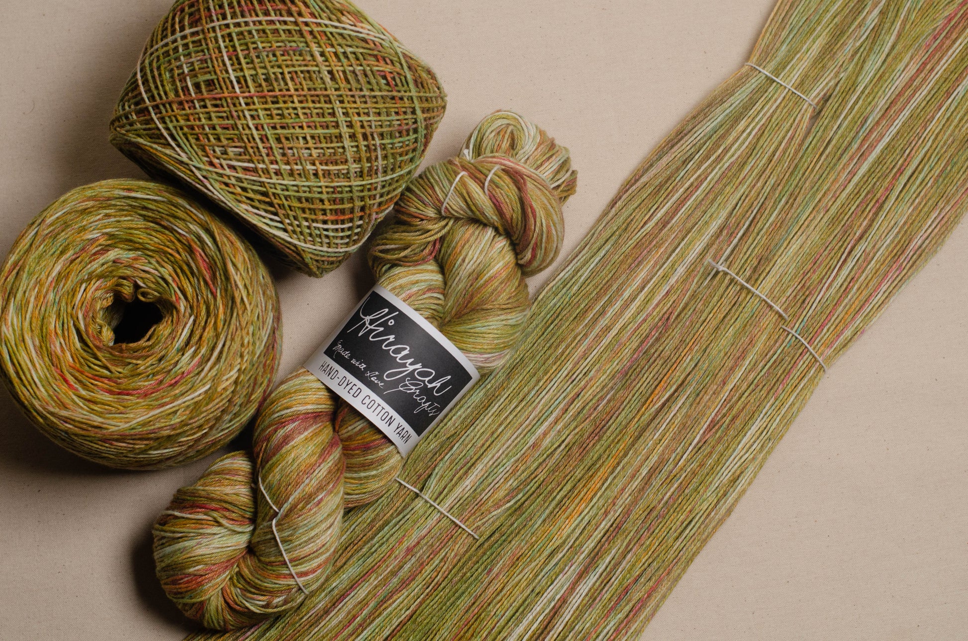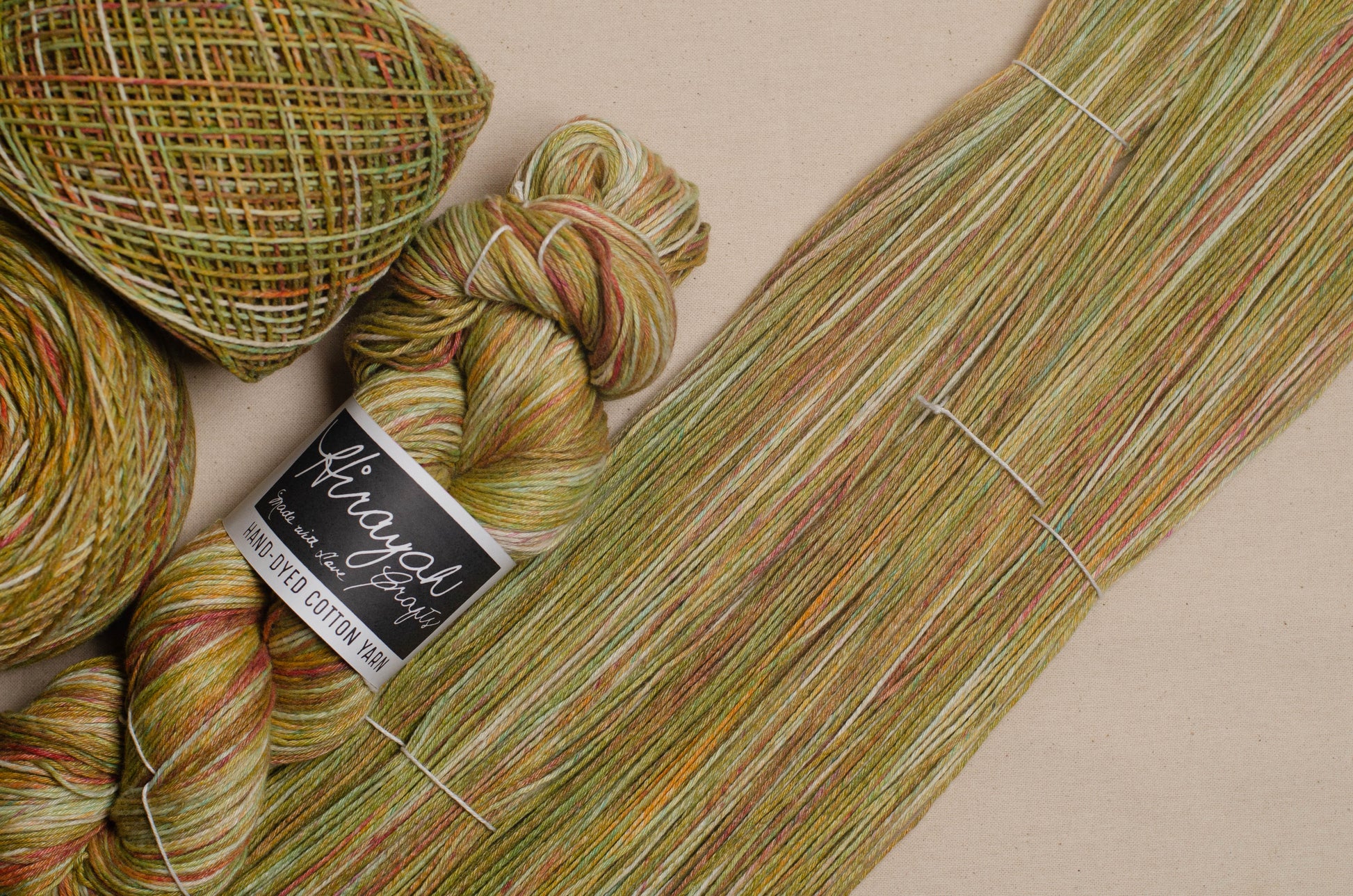 Light worsted weight/ 8ply hand-dyed cotton yarn.