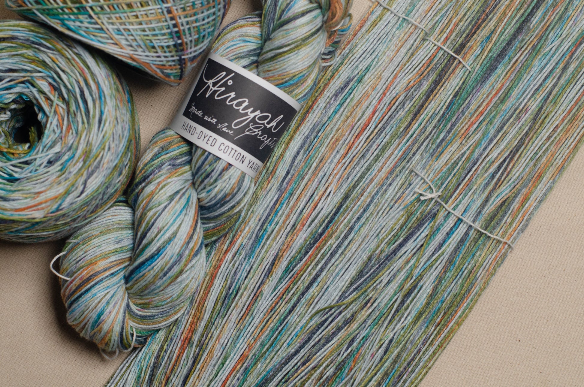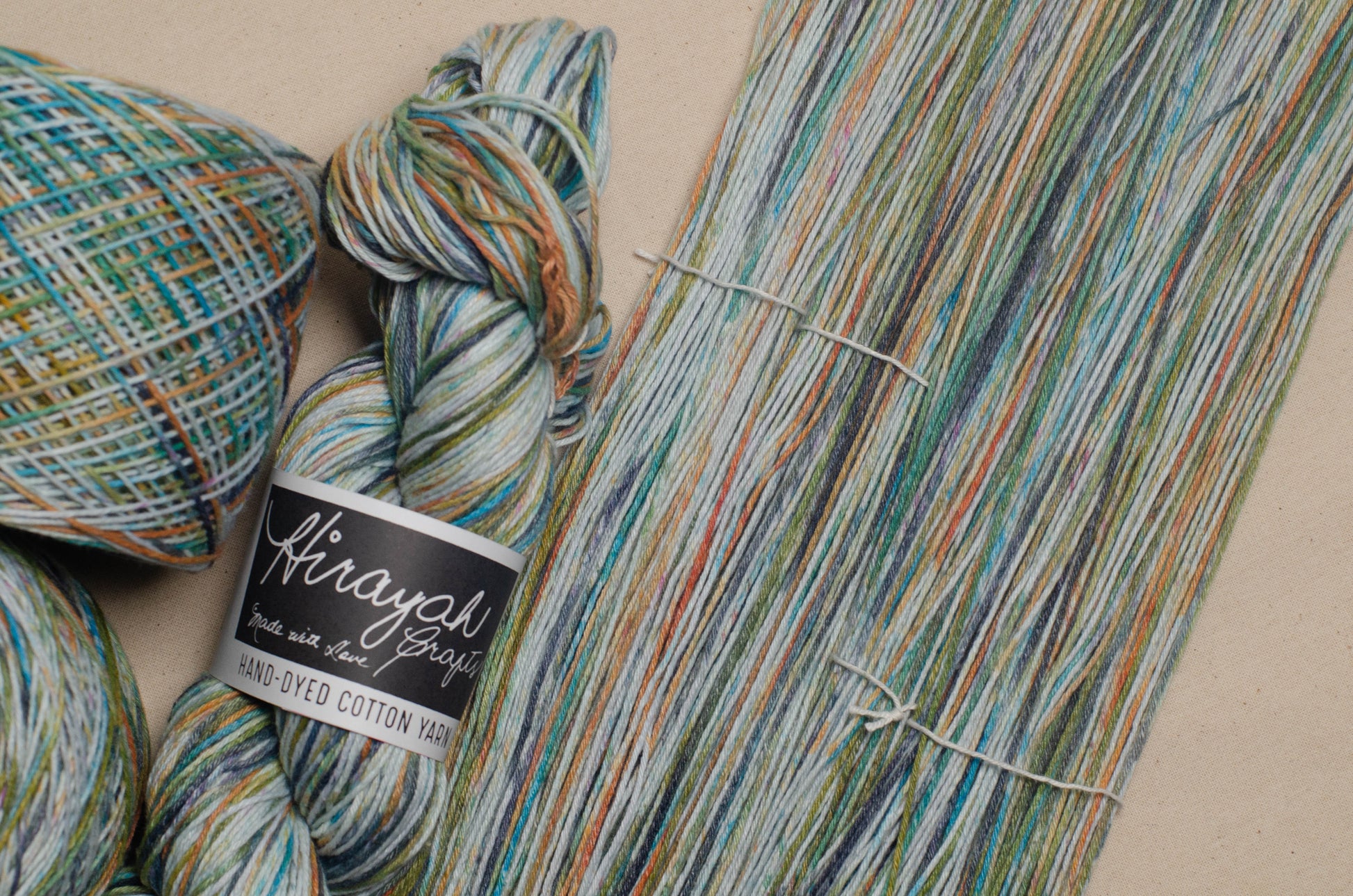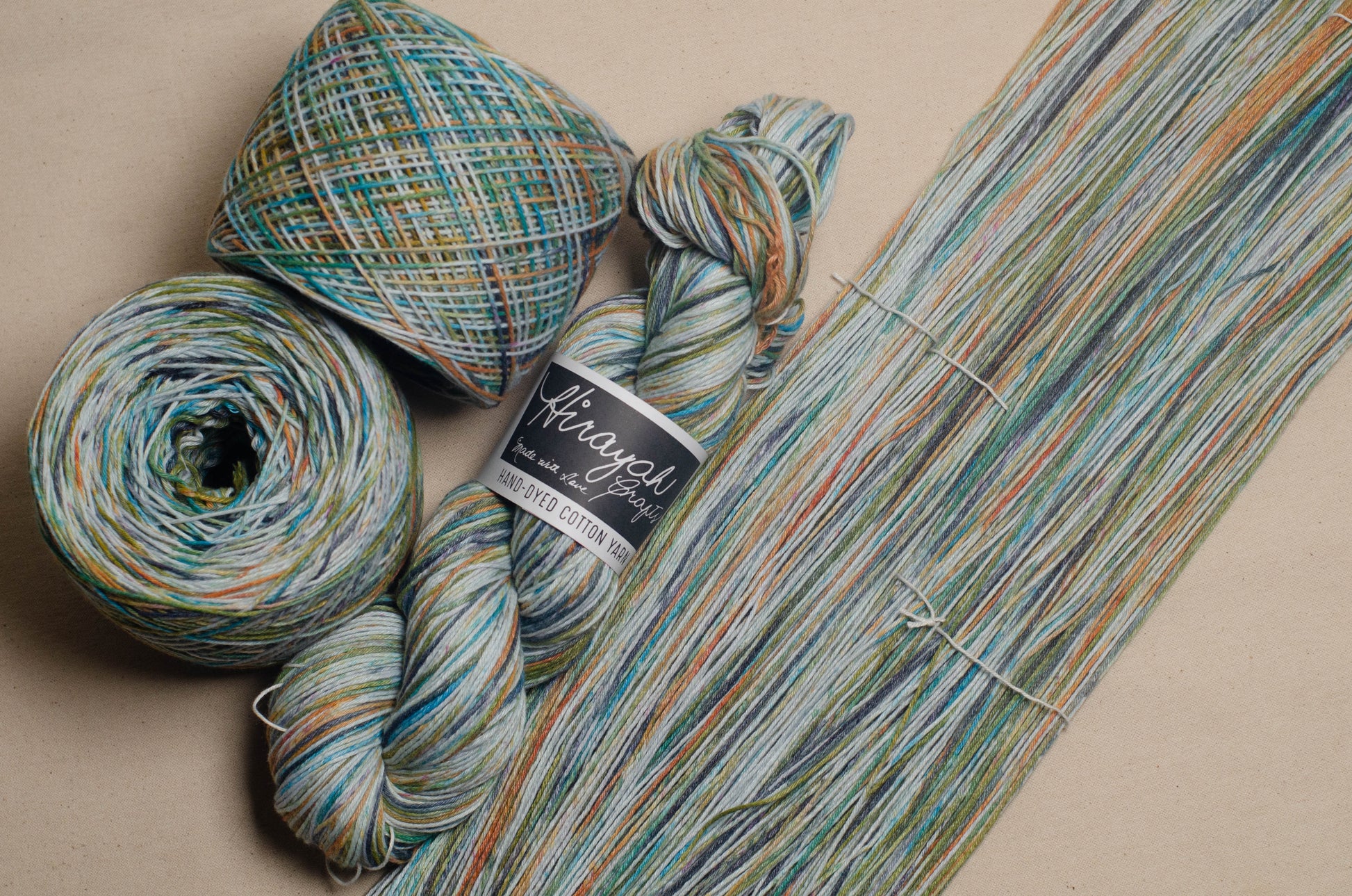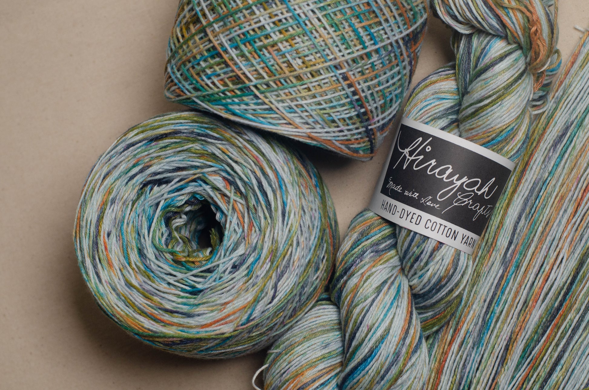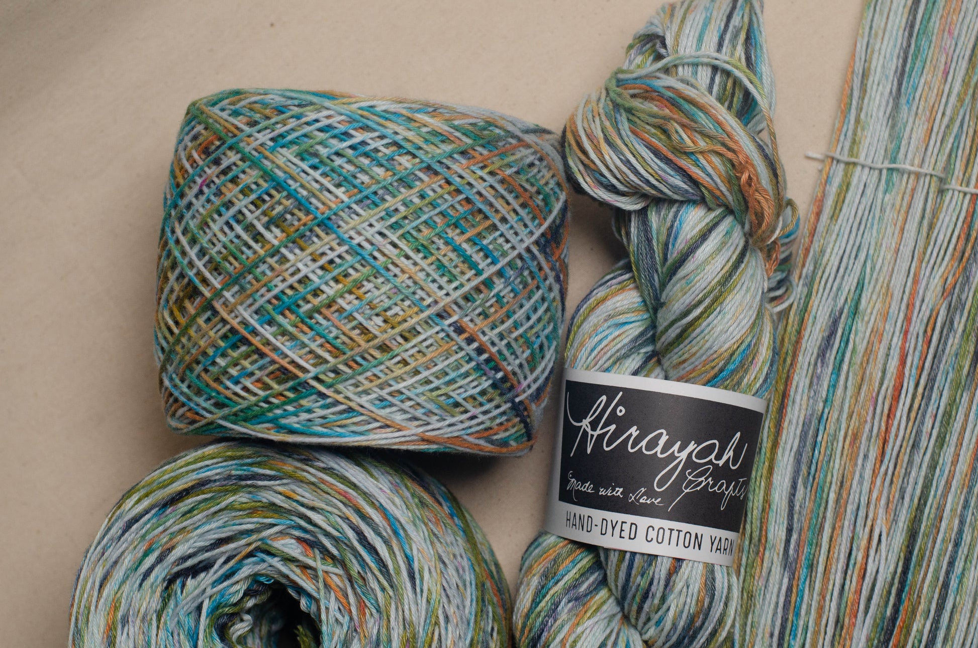 Light worsted weight/ 8ply hand-dyed cotton yarn.