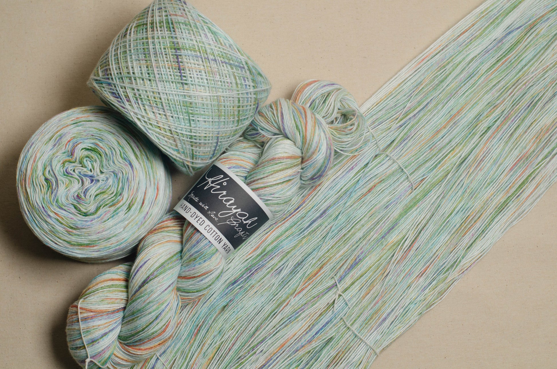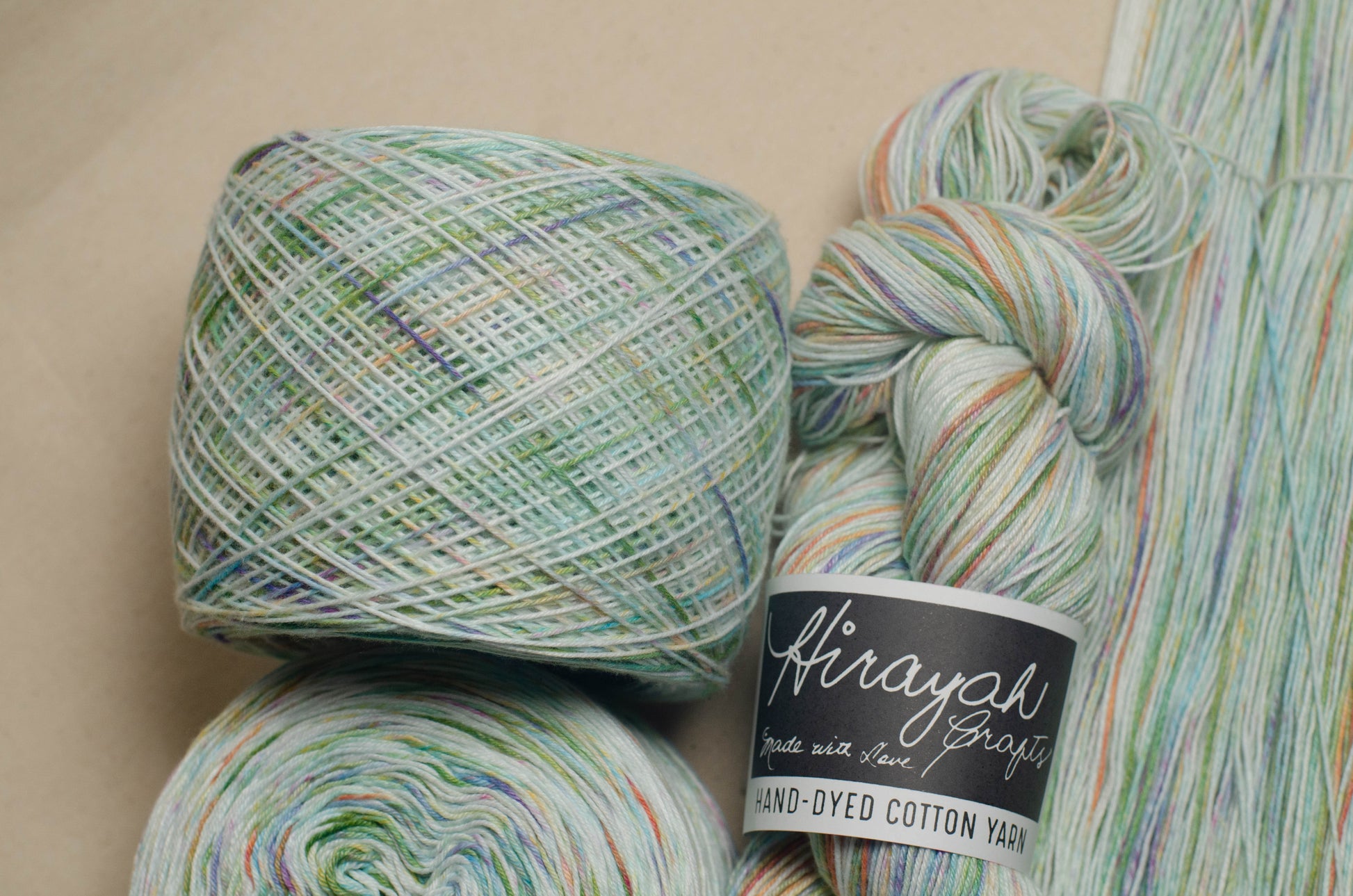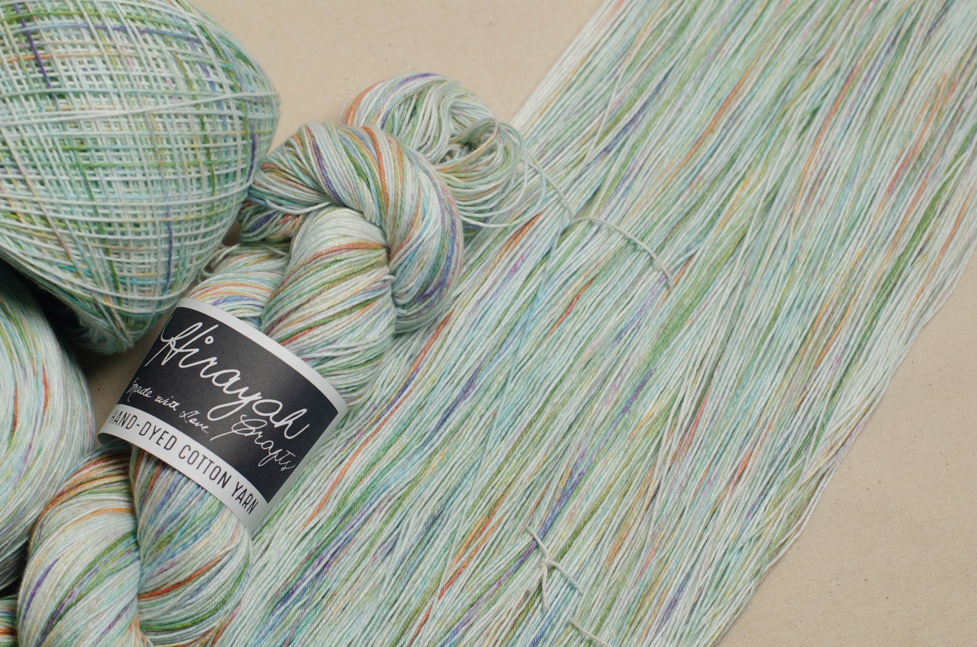 Light worsted weight/ 8ply hand-dyed cotton yarn.