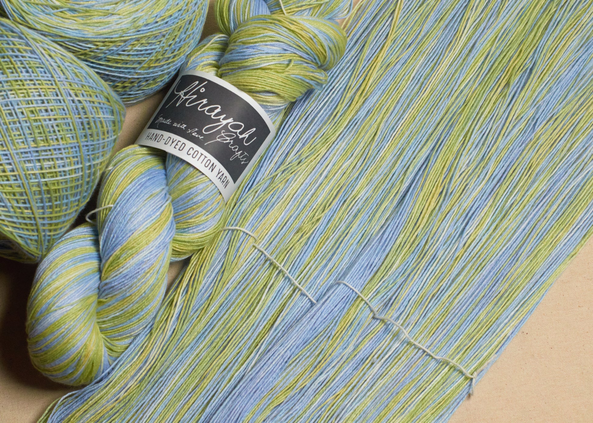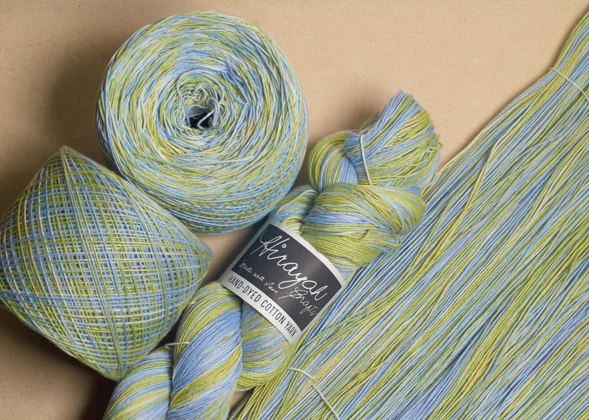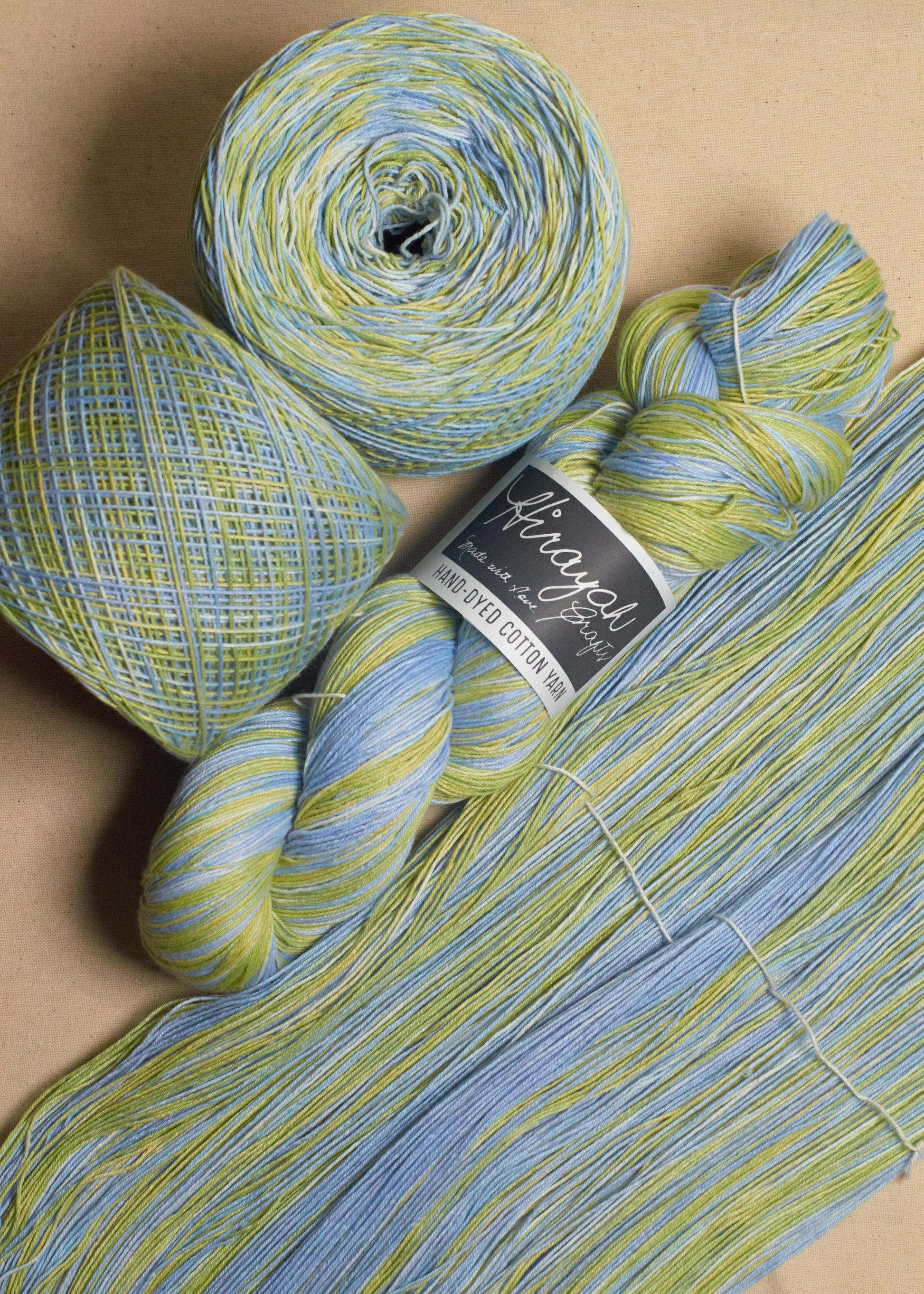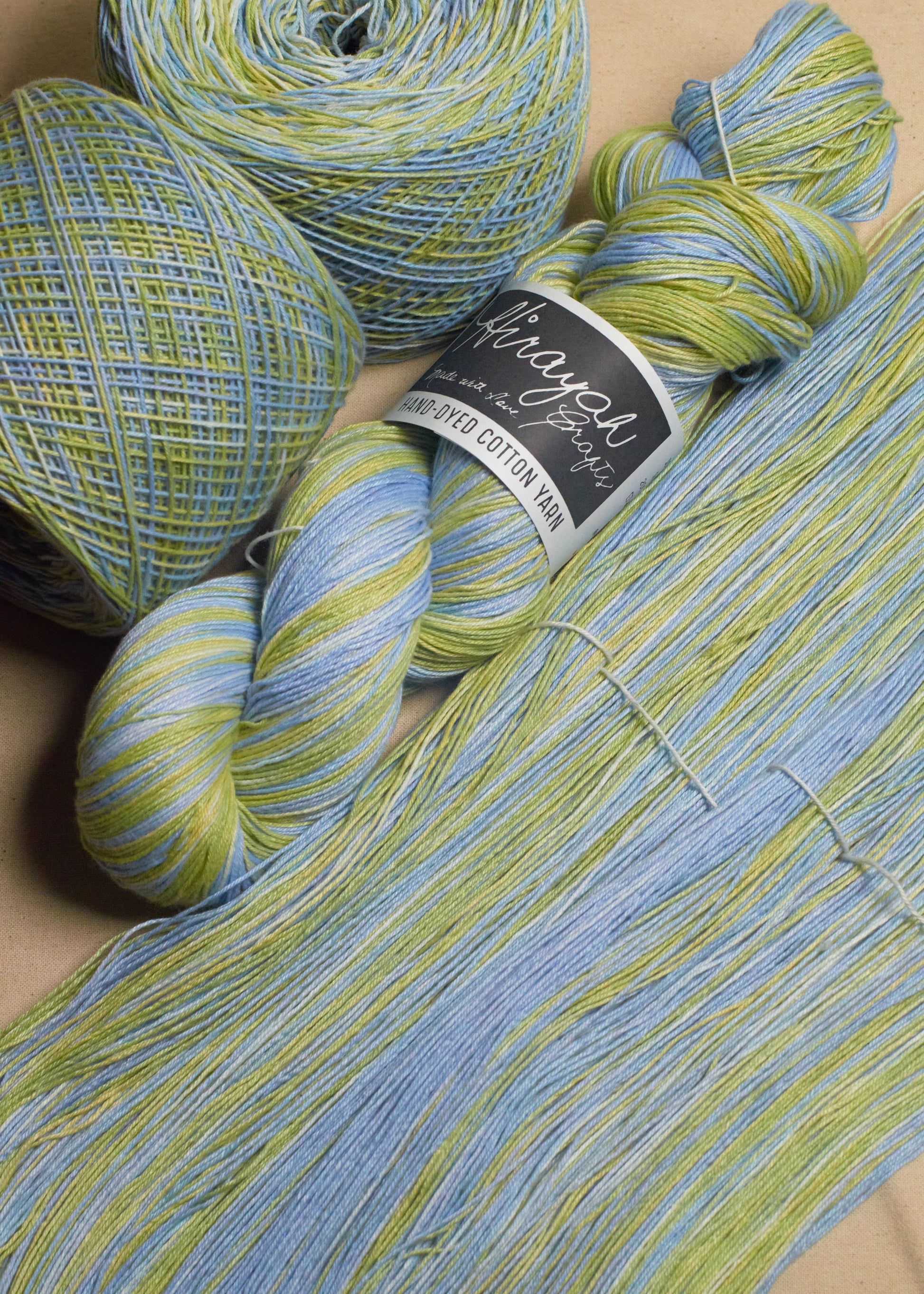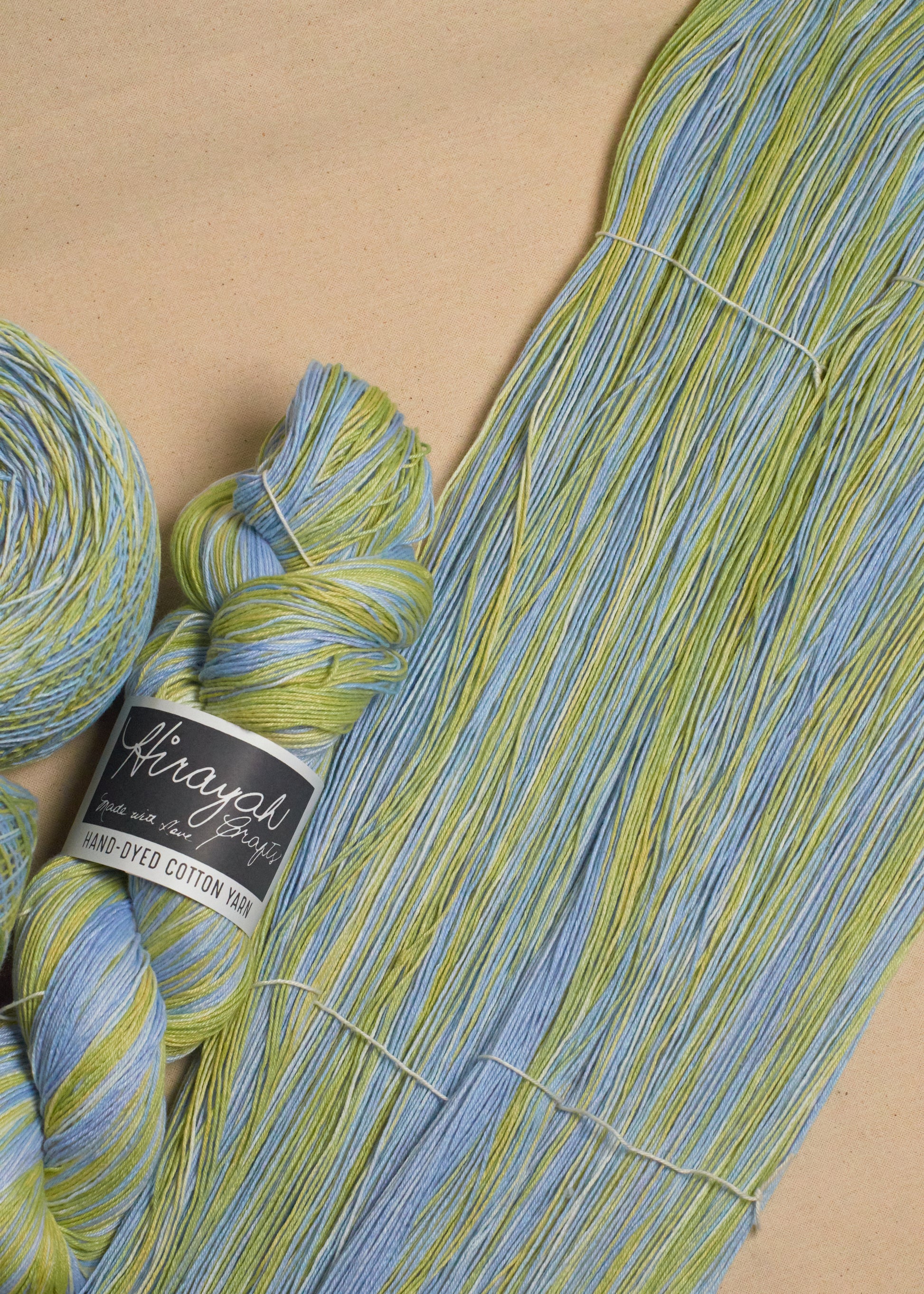 Light worsted weight/ 8ply hand-dyed cotton yarn.