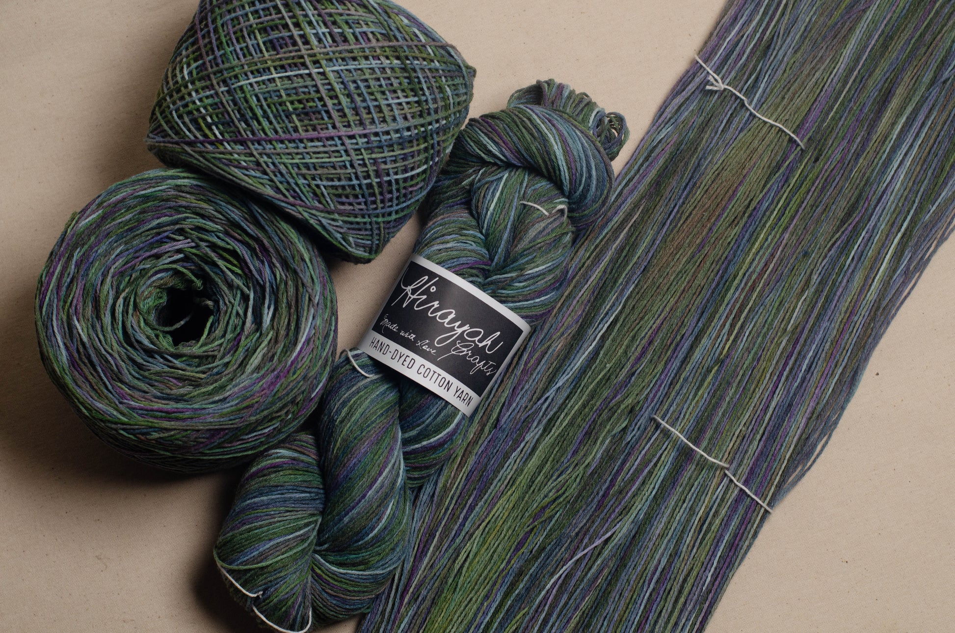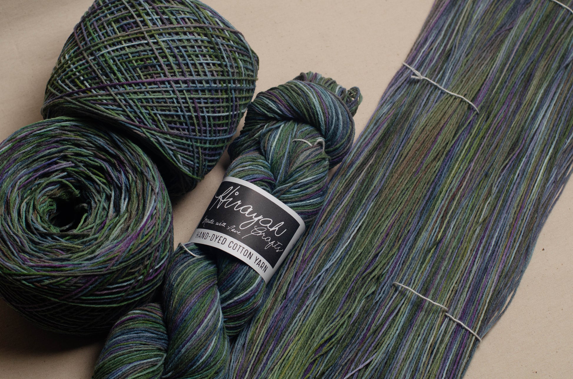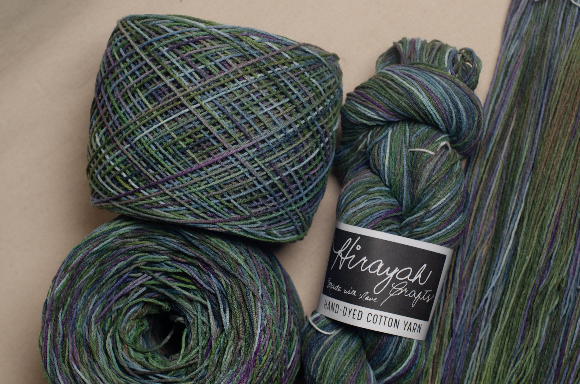 Light worsted weight/ 8ply hand-dyed cotton yarn.