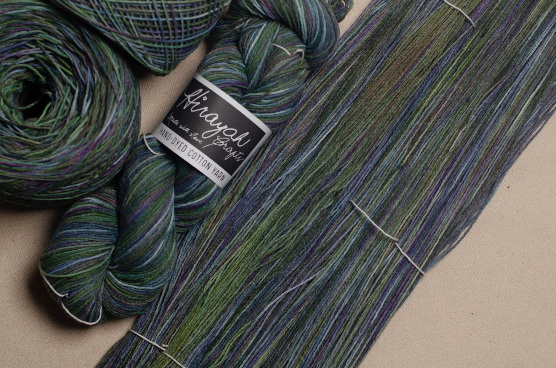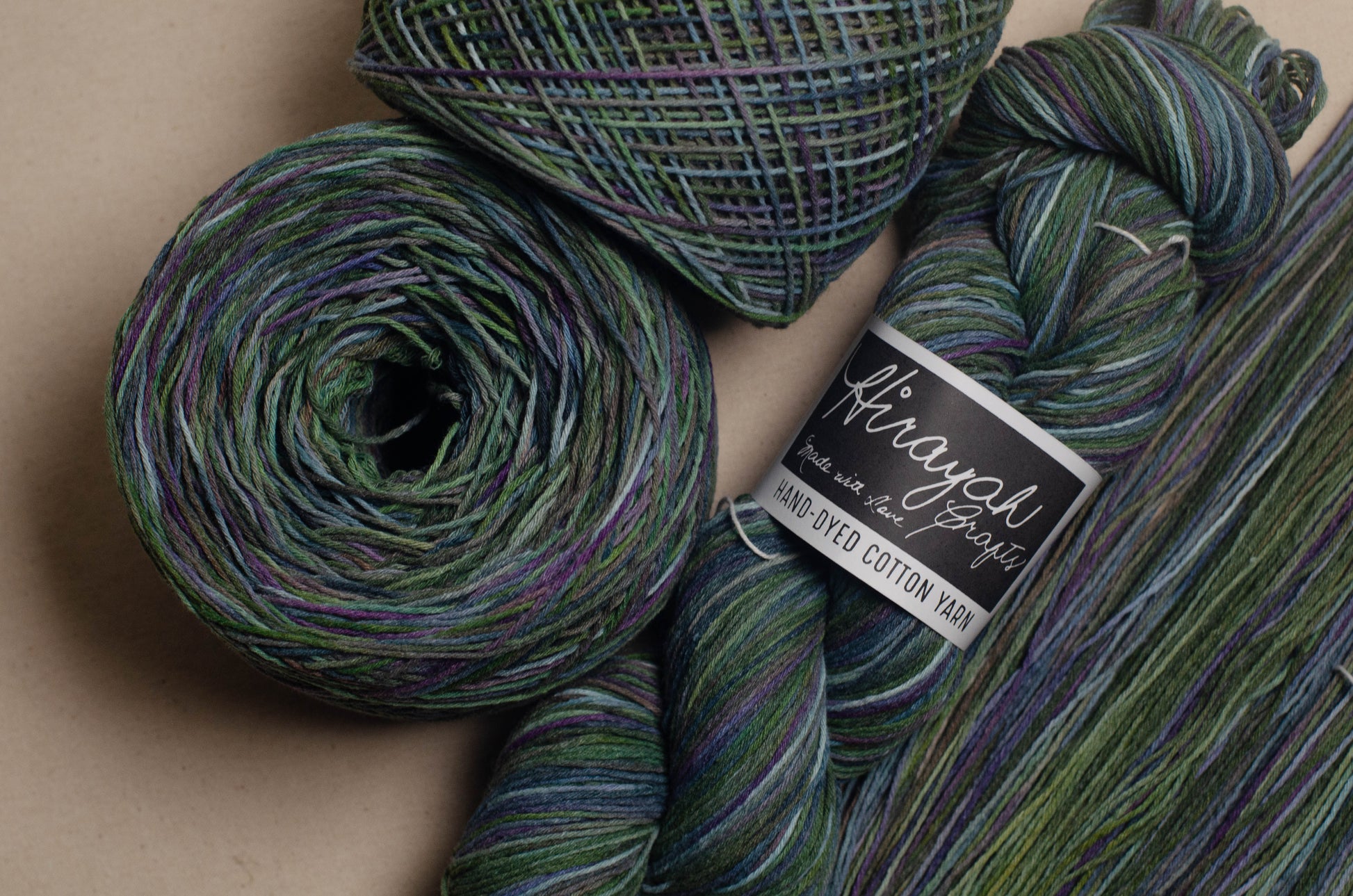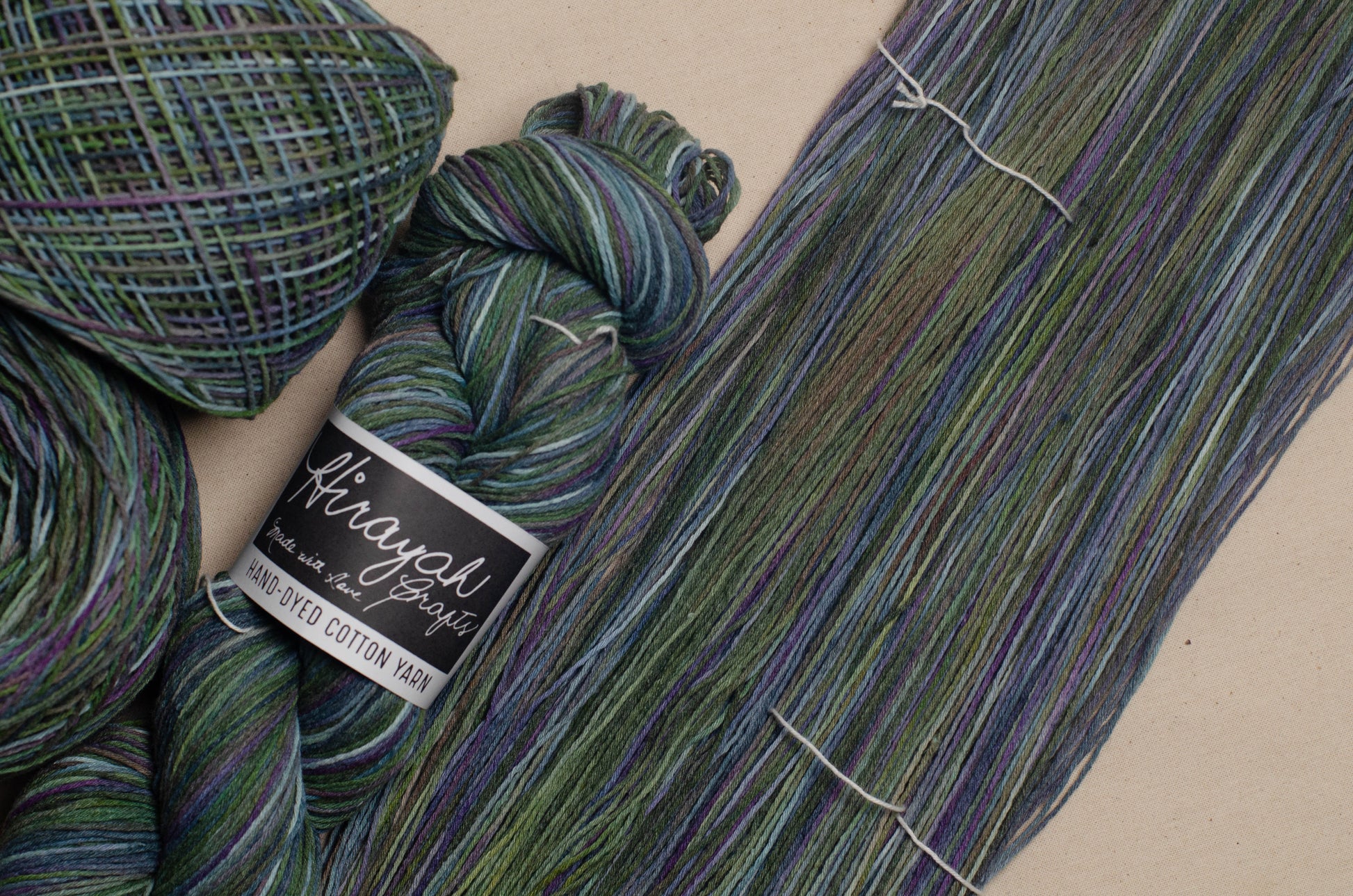 Light worsted weight/ 8ply hand-dyed cotton yarn.