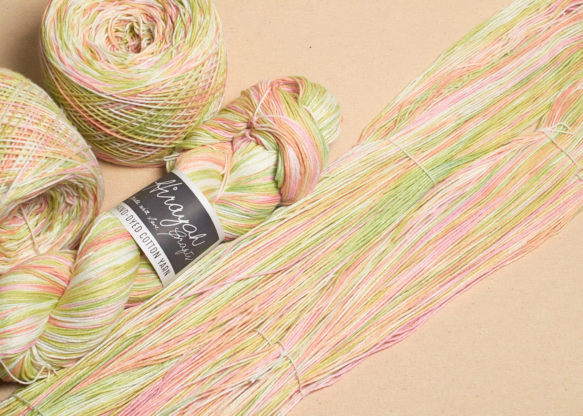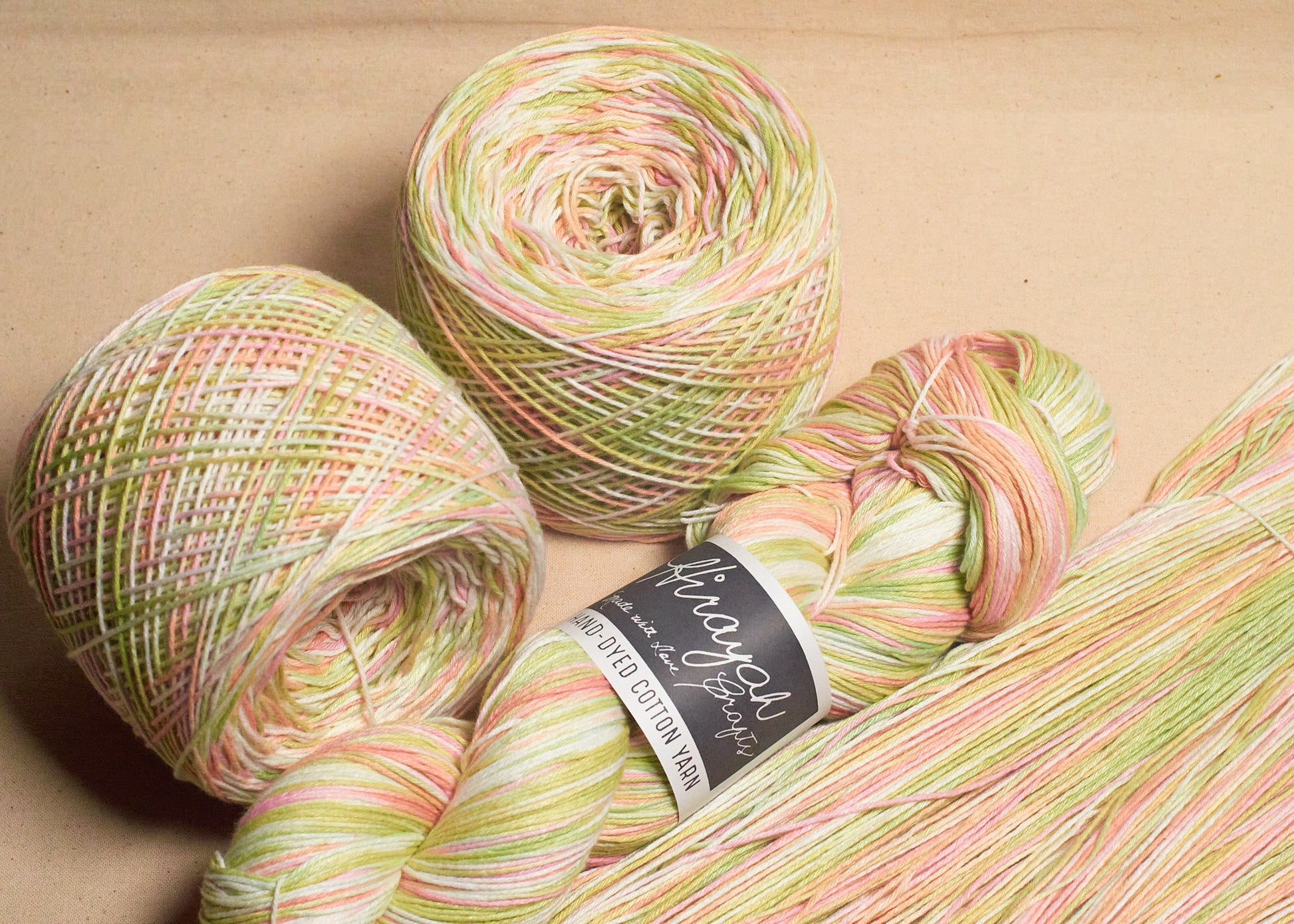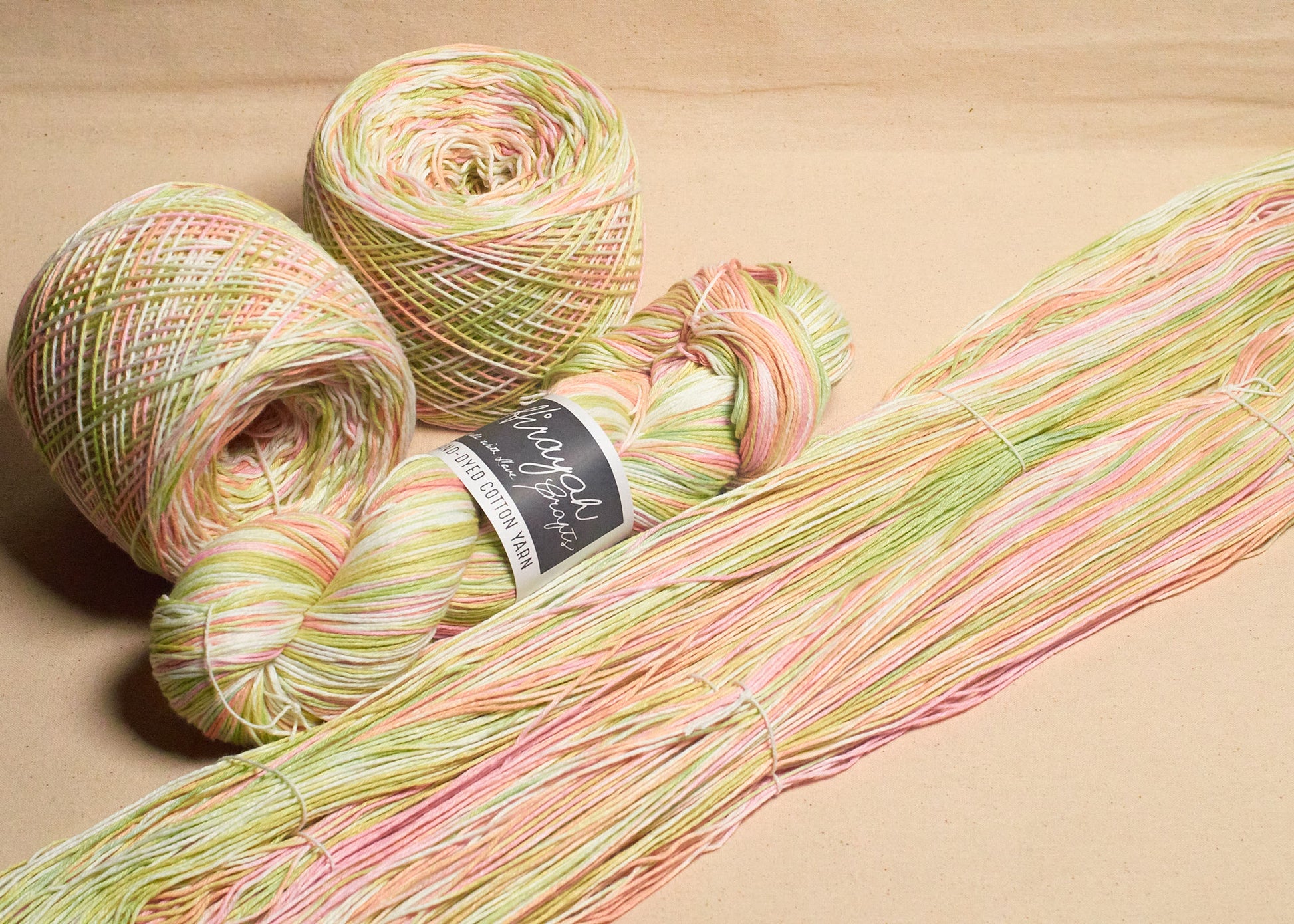 Light worsted weight/ 8ply hand-dyed cotton yarn.