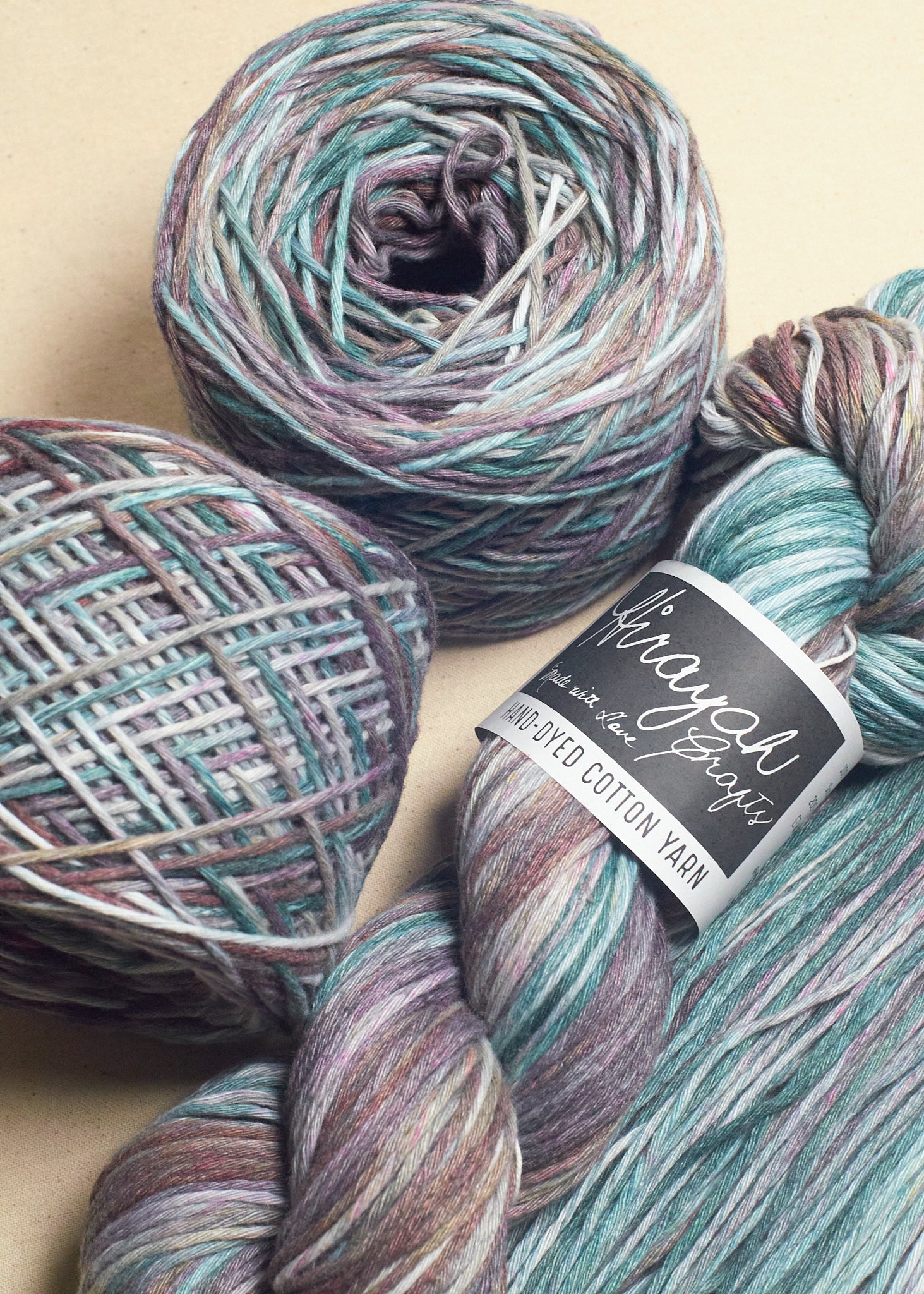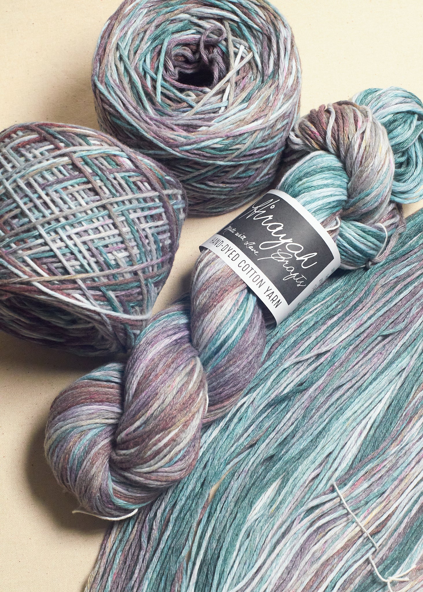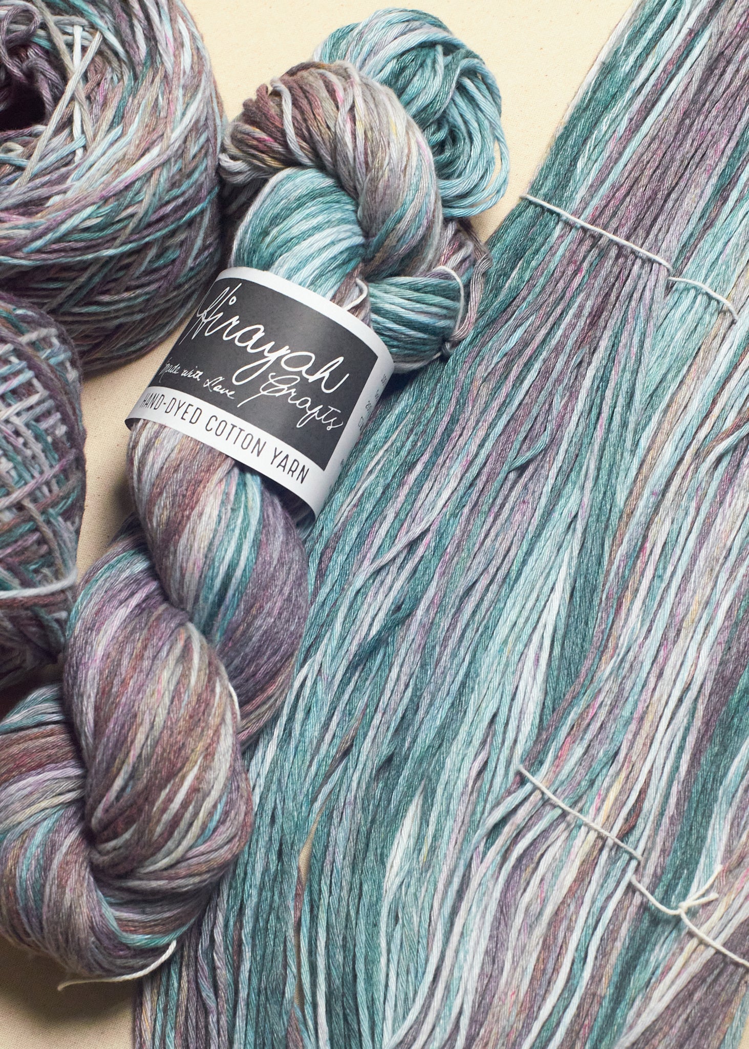 Light worsted weight/ 8ply hand-dyed cotton yarn.