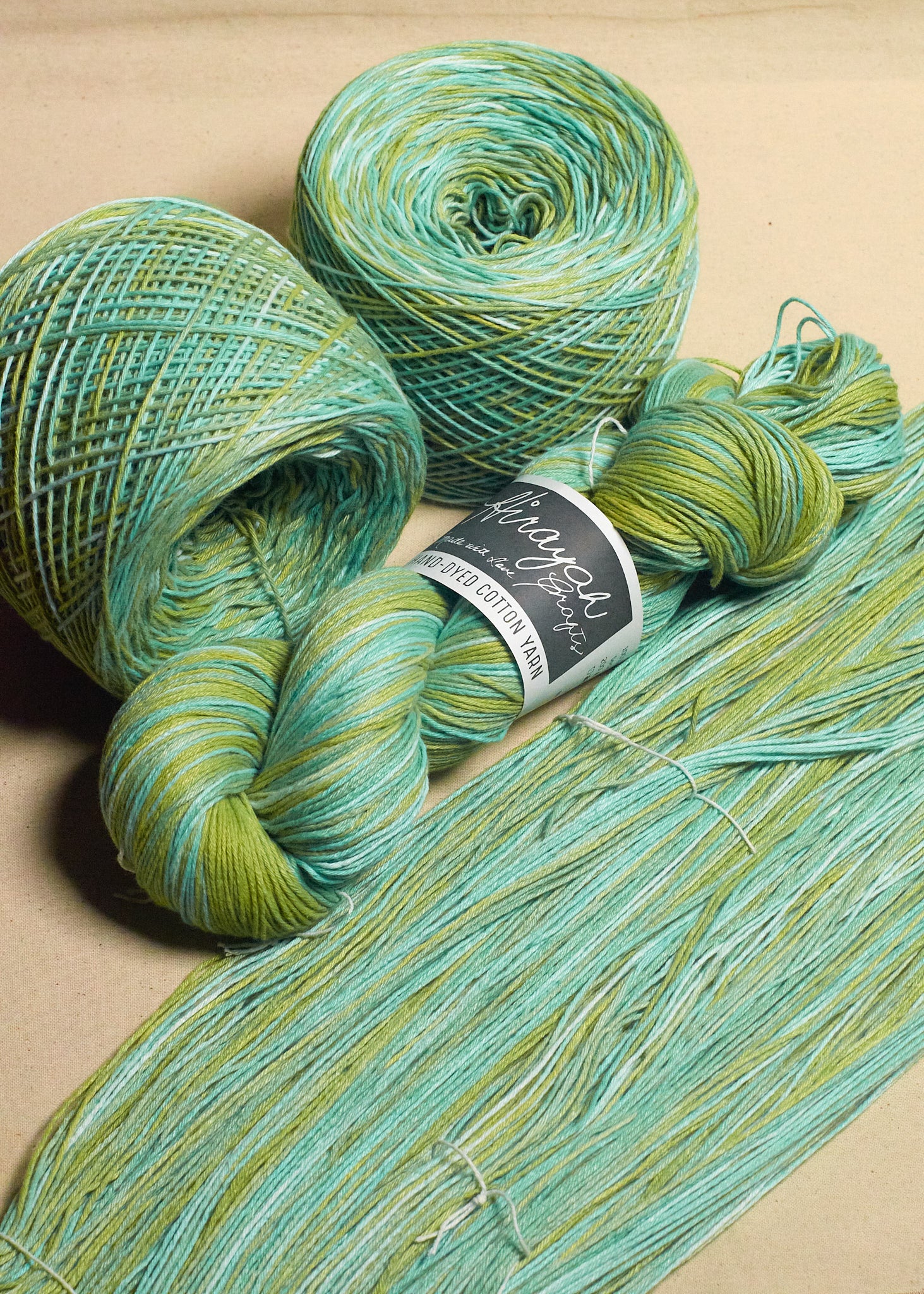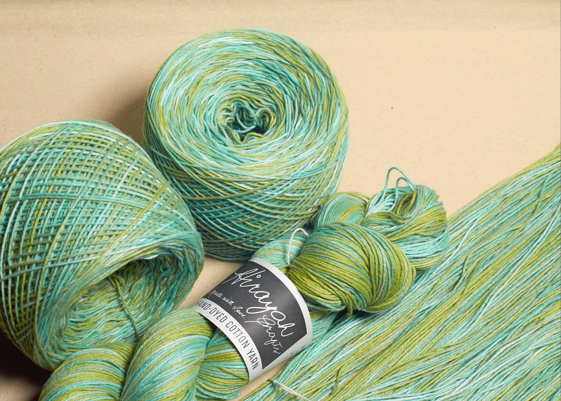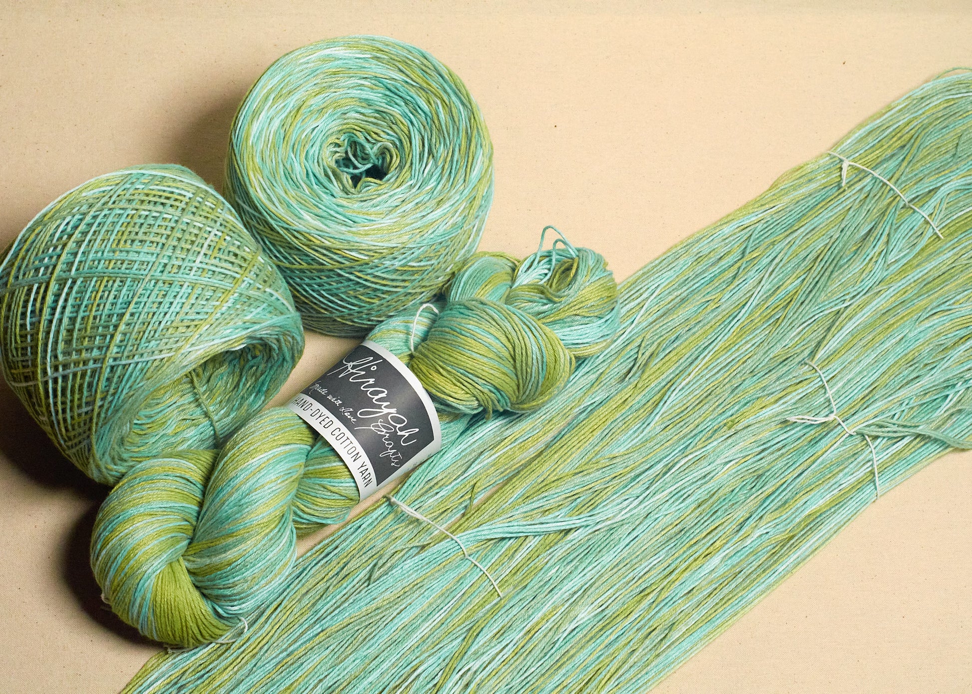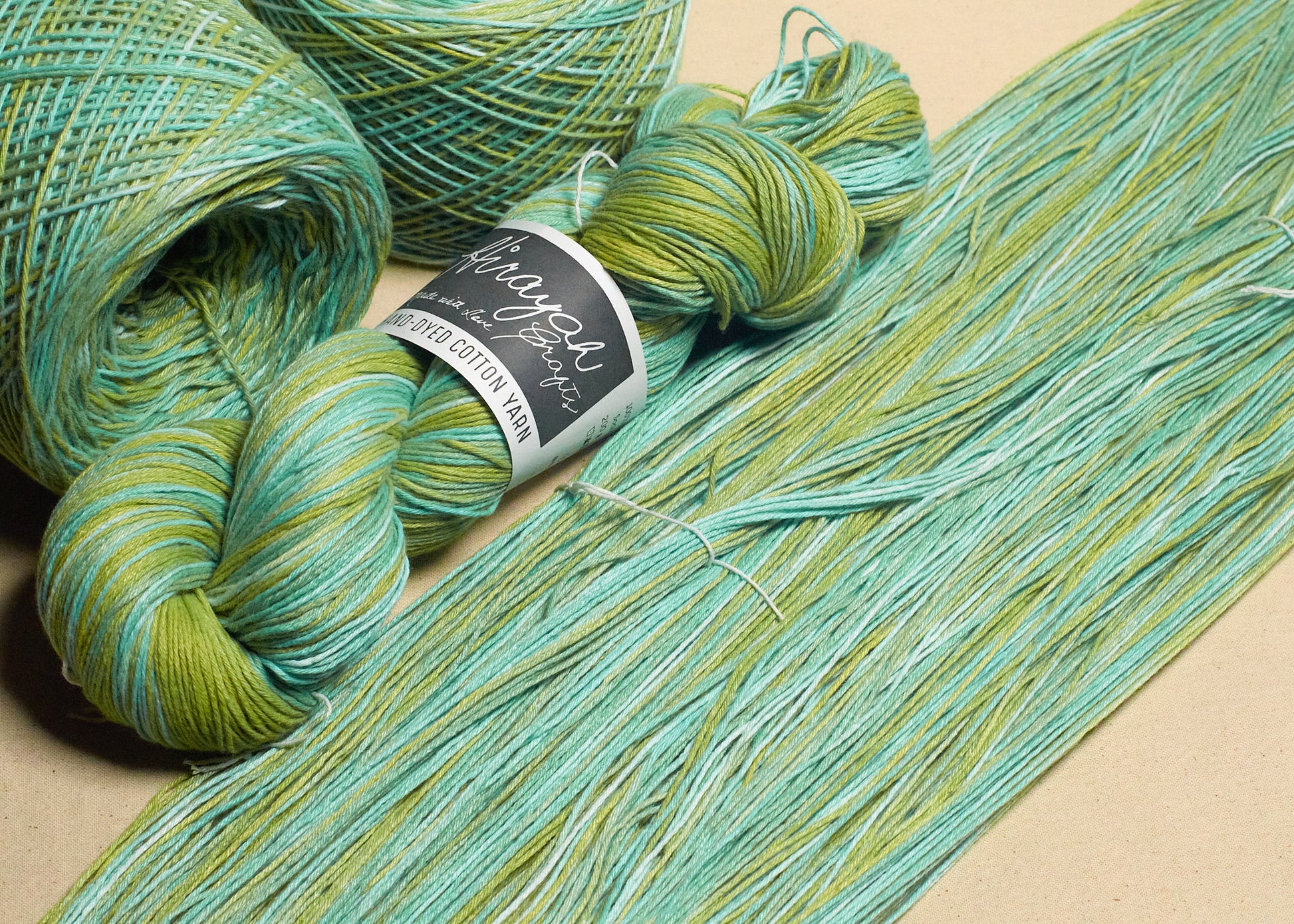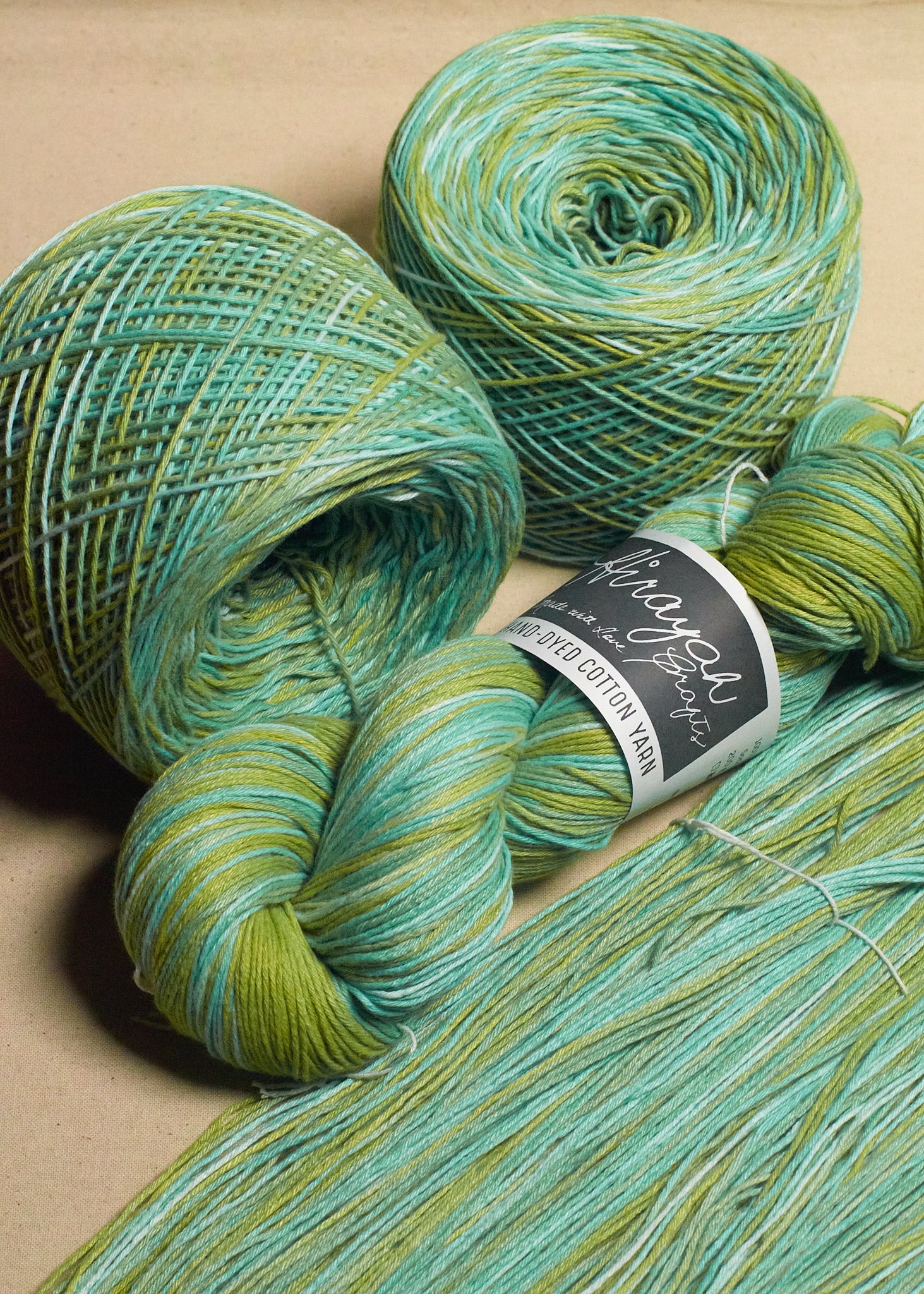 Light worsted weight/ 8ply hand-dyed cotton yarn.